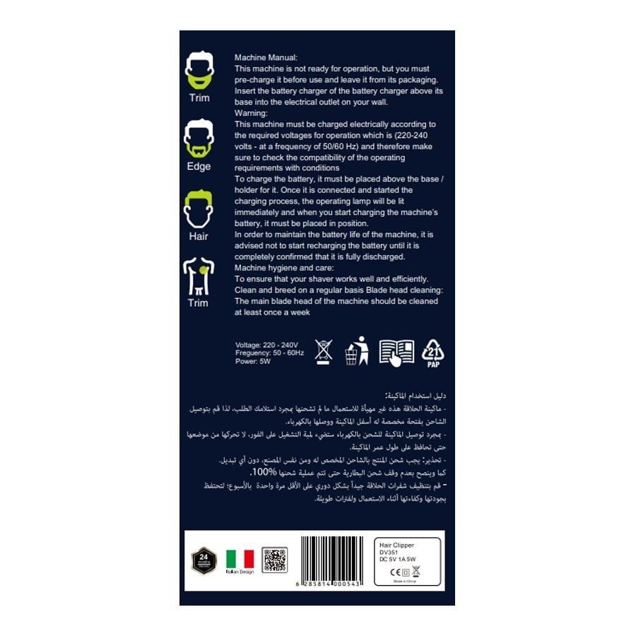 باختصار، مكينة حلاقة شعر تحديد وتنعيمDV351 متعددة الوظائف وتتميز بالتحديد والتنعيم، مع شفرات حادة وسهولة استخدام لتحقيق نتائج دقيقة ومريحة.