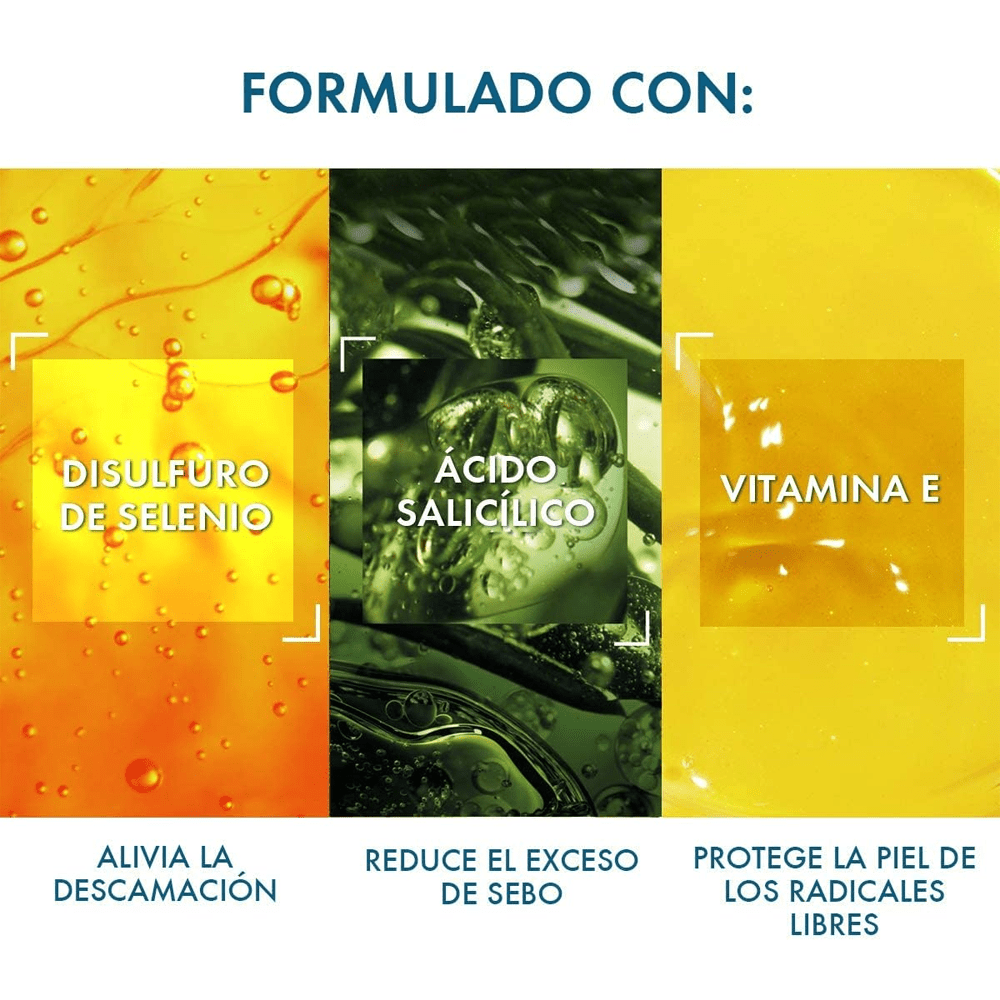 الشامبو يحتوي على السيلينيوم DS ، الذي له تأثير مضاد للفطريات ، مما يساعد على تقليل الاحمرار والتهيج في فروة الرأس.